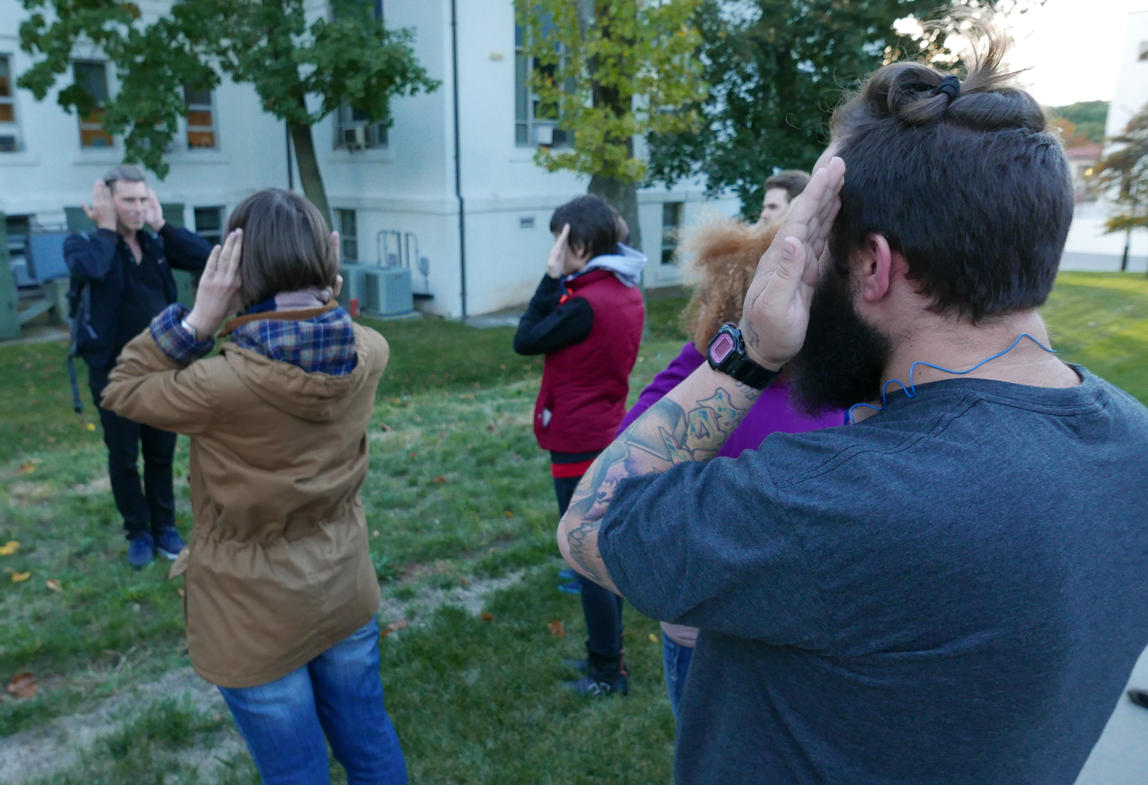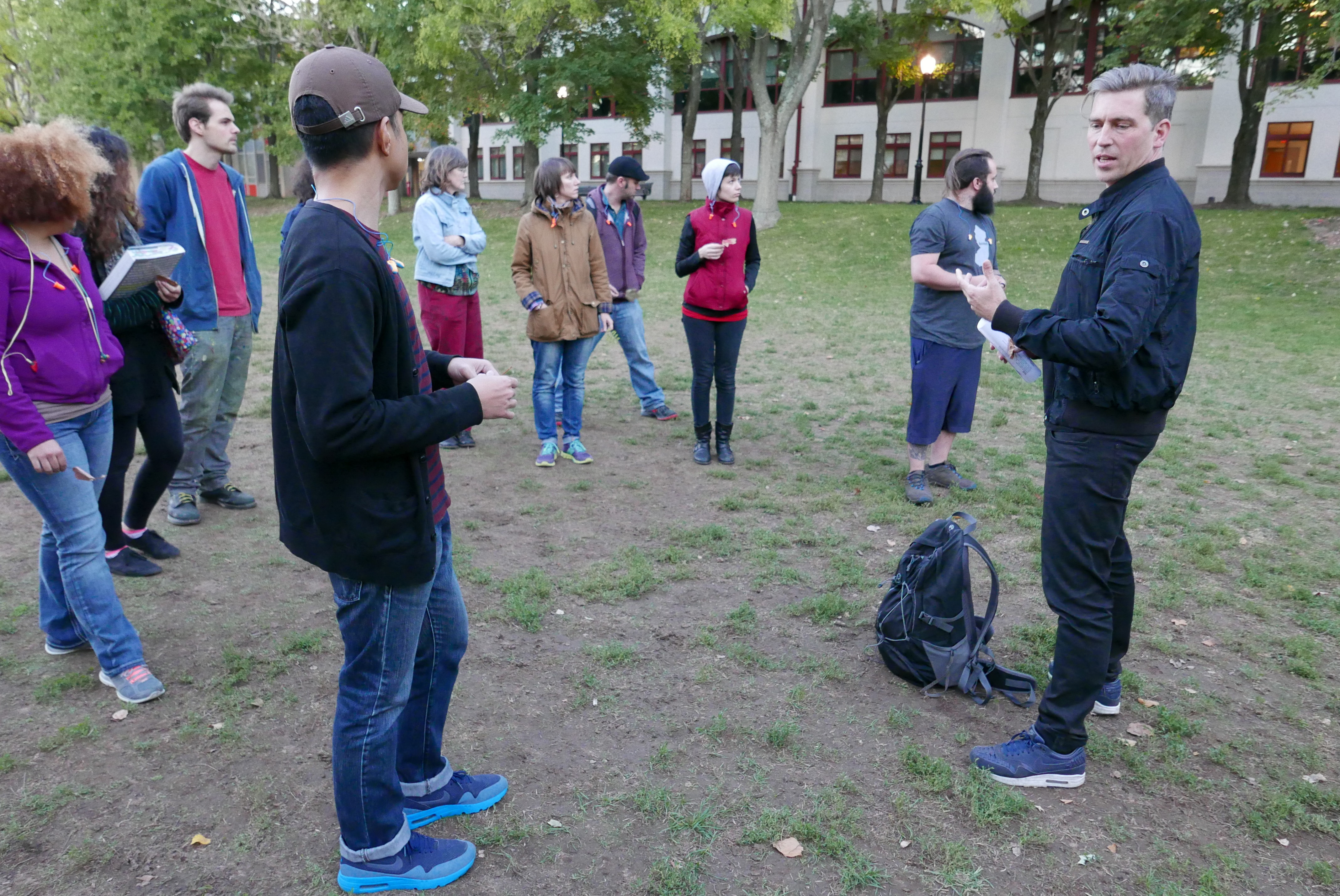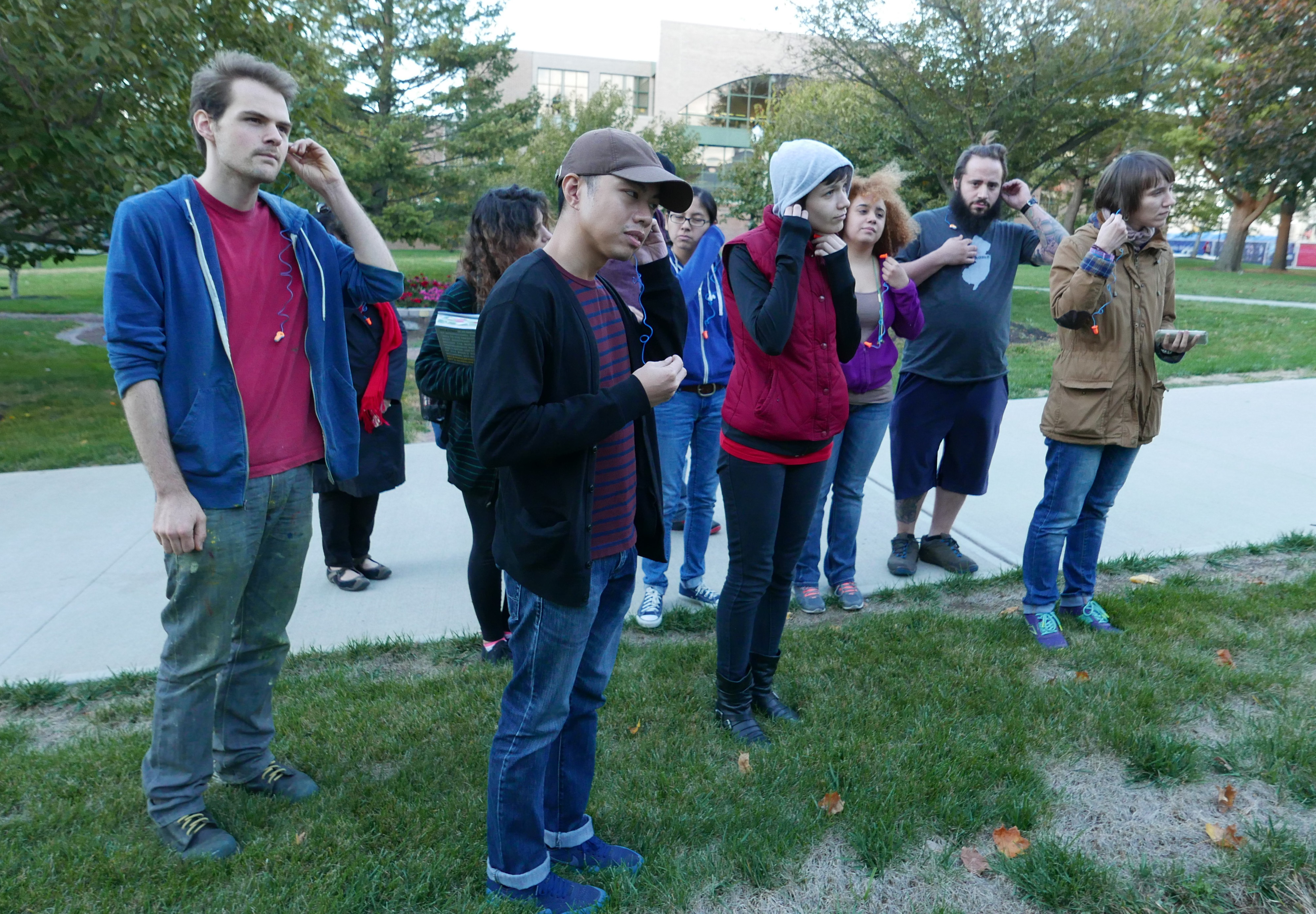 Conceptual artist David Helbich recently guided students on a walk through Montclair State University. In the public space, a series of aural exercises were carried out to position the participant as both performer and audience at the same time.