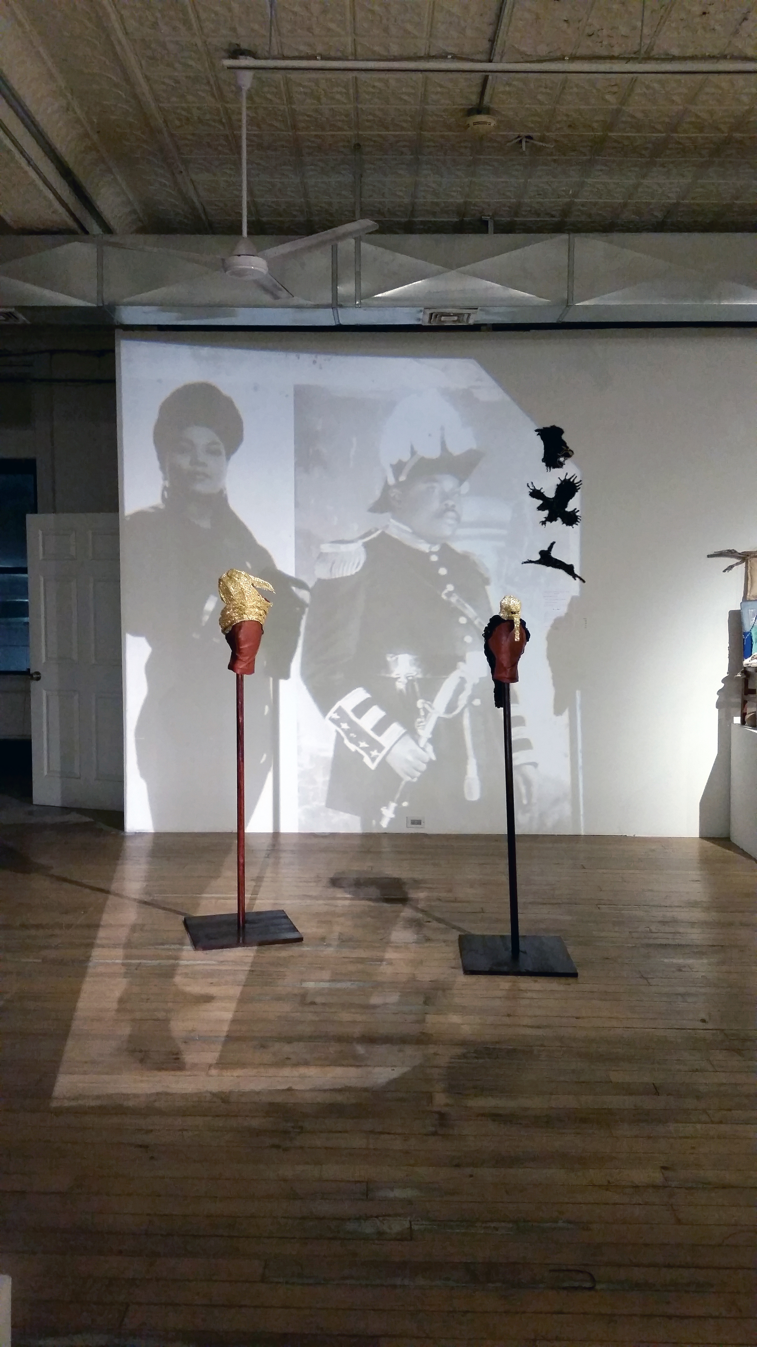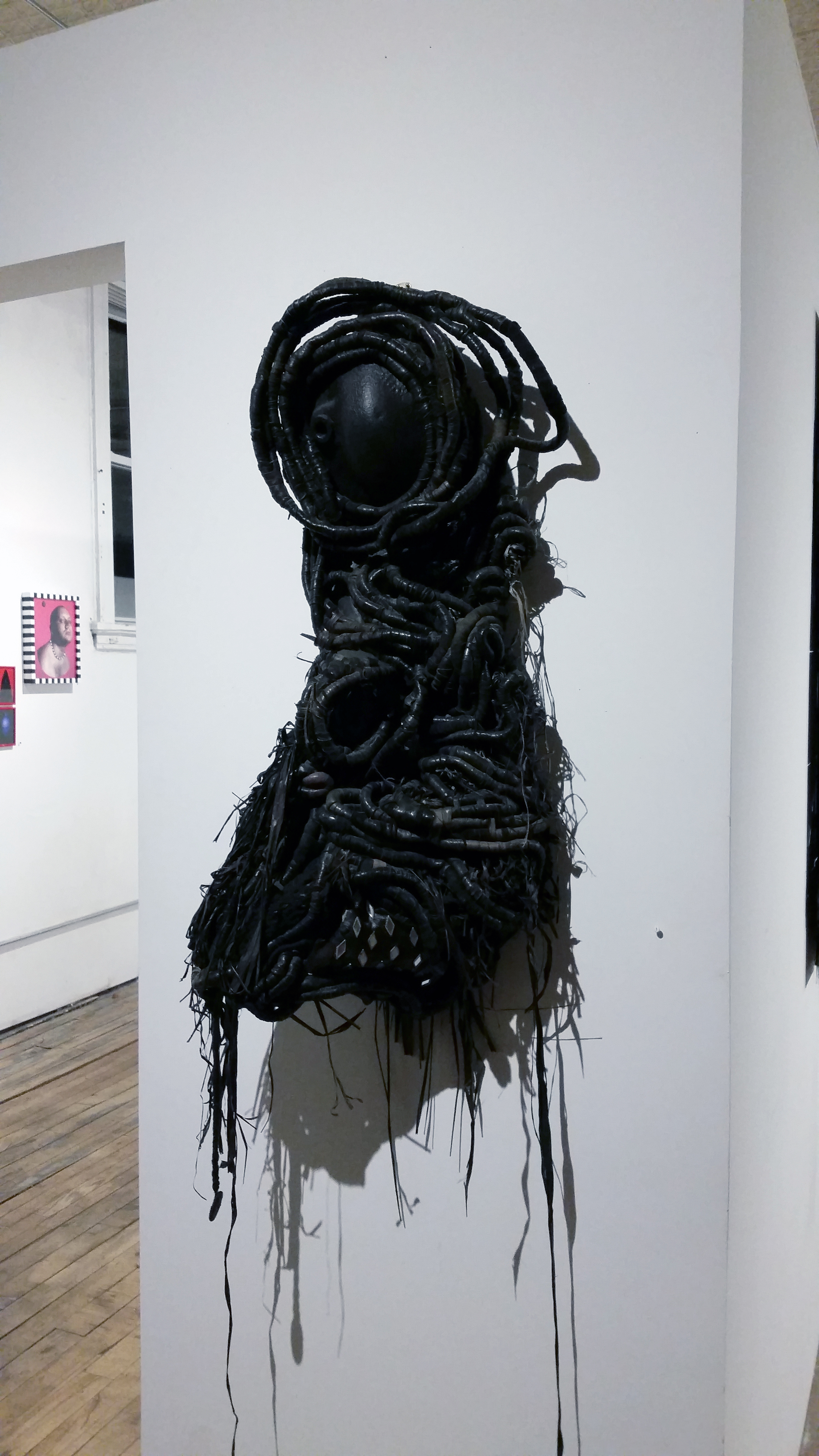 The quiet stillness emanates from a captive audience as these pieces are observed. It is in thought that we look on and question the existence of such beings and their messages. Each piece is a standalone work but compliments it’s neighbor in the shared space. There is an organic flow throughout the gallery as you pass from one piece to the next. From one being to another, you are taken to another world as these pieces speak to you of their past–reliquary-like in their stoicism. Questions arise, more than are answered as the dark eye cavities from Dominique Durosea’s figures look inside your mind. You break your gaze to move onto another equally enthralling stare, engrossing full attention. For a pause, you are blended with black paint, feel the weight of steel bowing spine, supporting the burden of trespassing stereotypes. Which is complimented by Noelle Lorraine William’s commentary on reinvention and self-transformation to emerge from implied characterization.