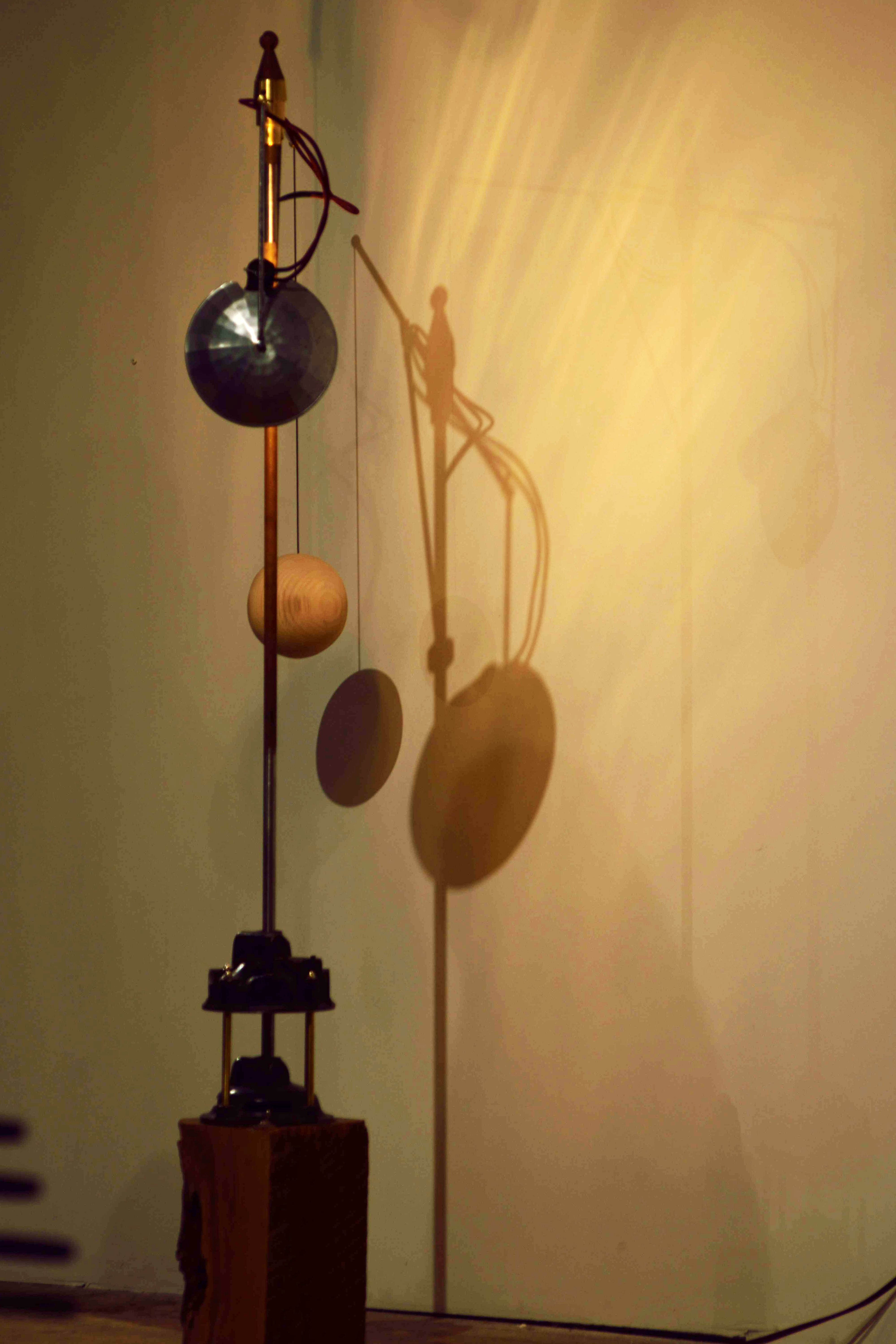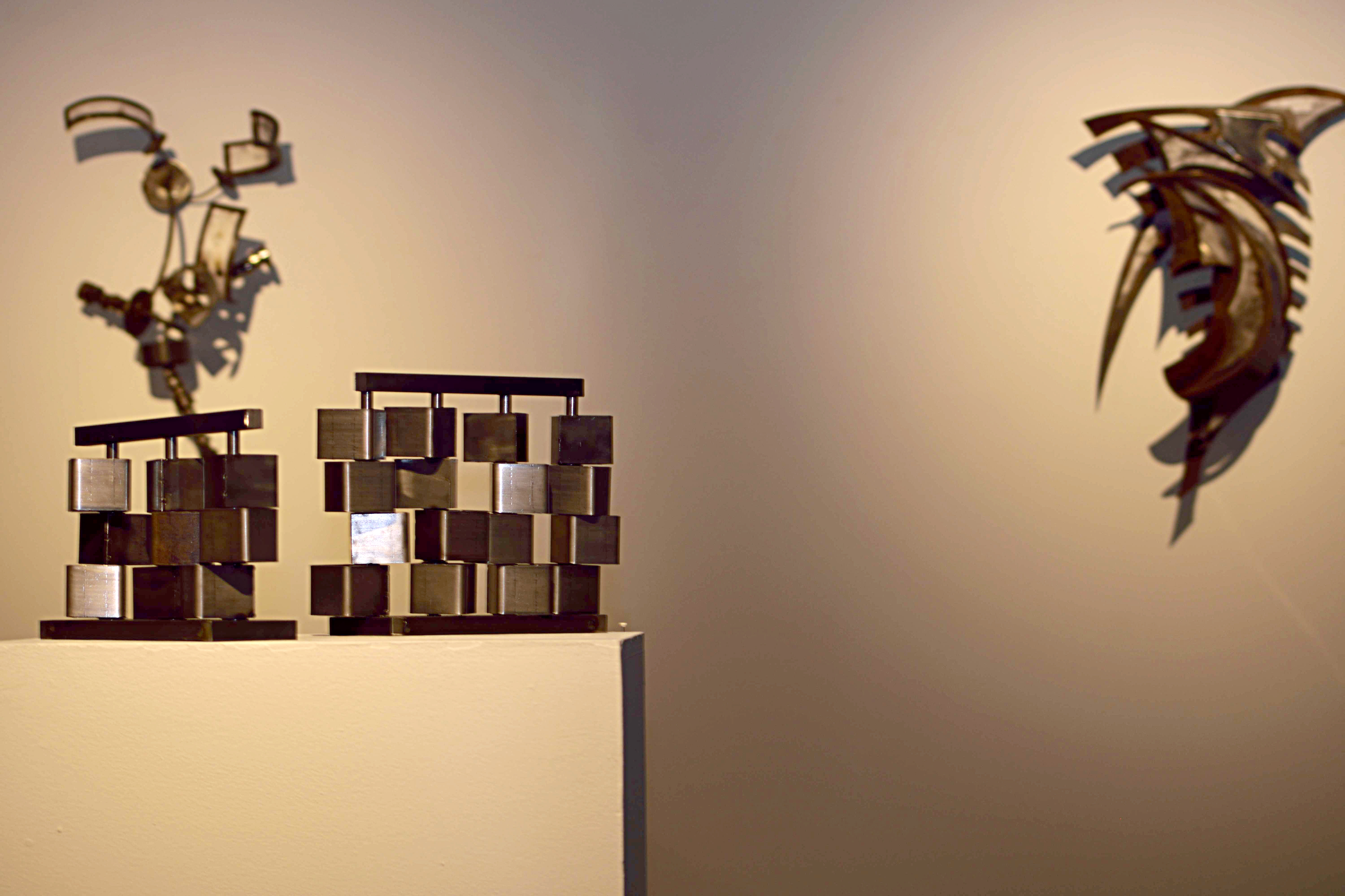 The intricate metal sculptures of Kevin Merkel are woven through the room, offering curious movements of geometric forms. Operating somewhere between art and function, the near-alien-abacus-like machines indicate a higher purpose for their creation, yet we lack the understanding to accomplish the task. Each piece engages the audience through visual and tactual sensations. Merkel identifies his work as attempting to “liberate the material forms so it may realize its actualized vision.”