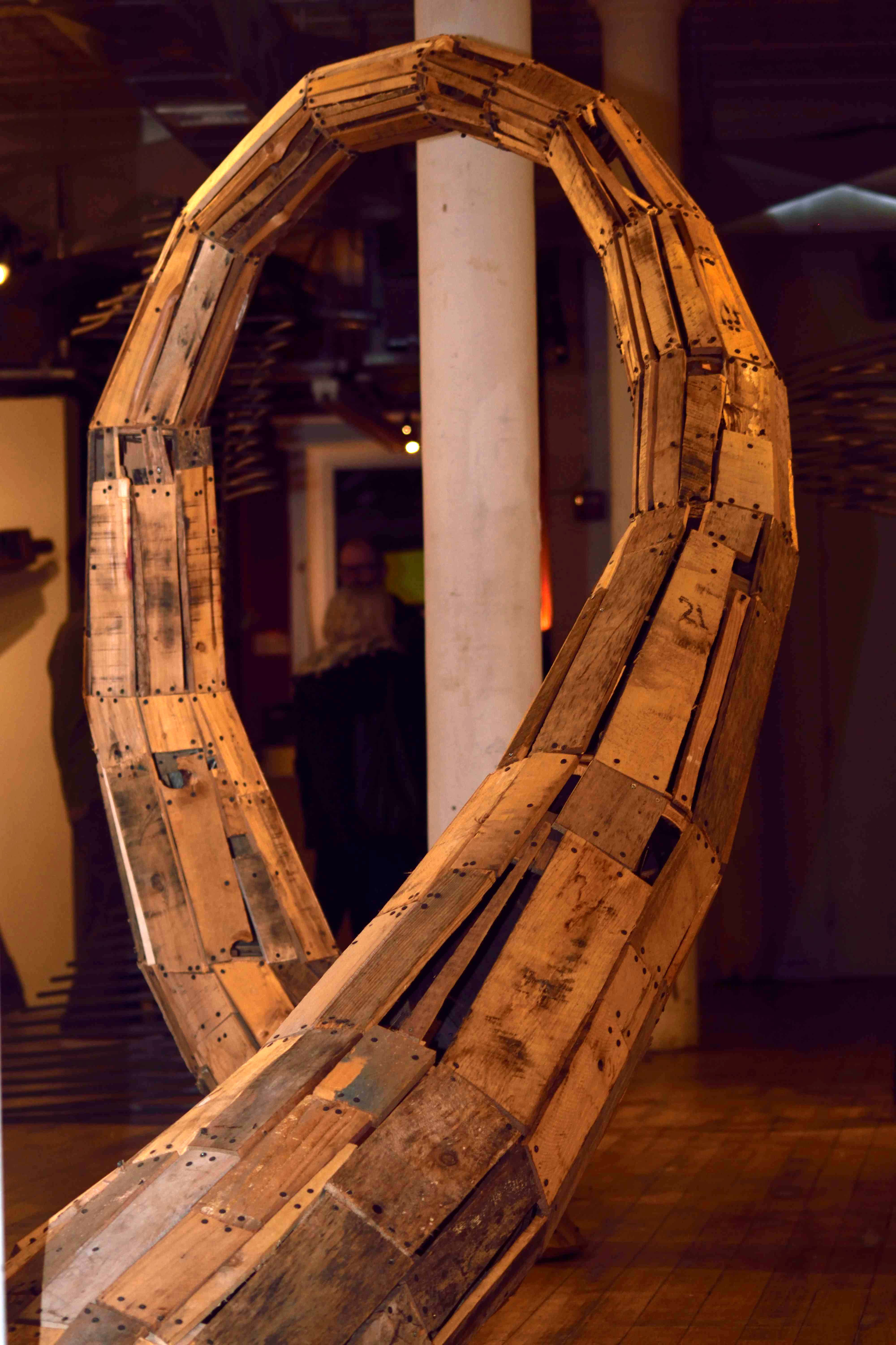 Its form is delicate and bold. Created from dismantled cargo crates and reassembled into a structure of tension. The wood scraps of its skin, twisted around its form as its body motioned up and down. A wave of wood, the piece intended to reflect the motion of energy via the systems of wind and water.