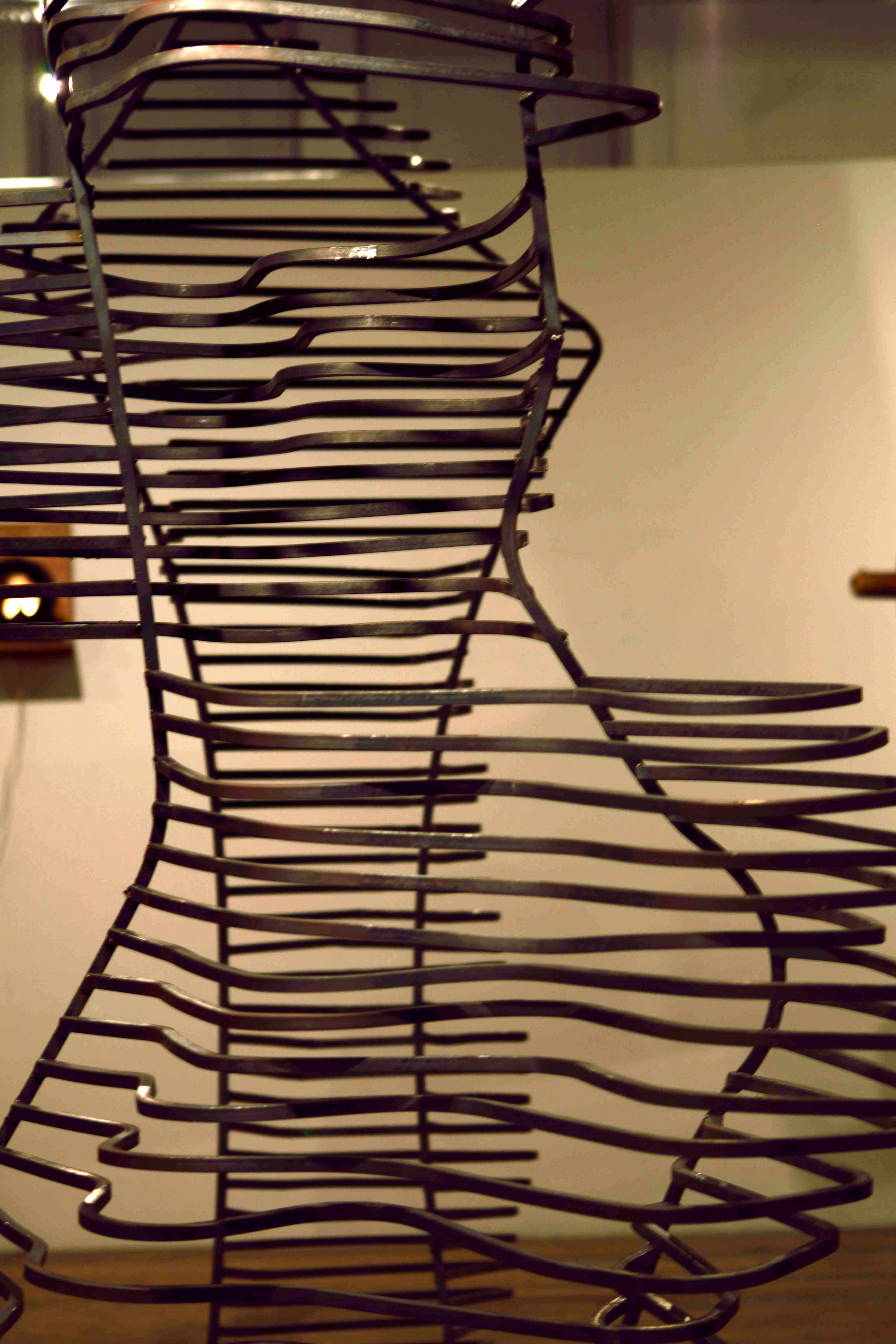 Roth’s most successful piece, is that of a metallic womb-like mass. Balanced on its apex, the work nearly hovers for the viewer, a large hole cut in its center, exposing the organically flowing insides, as if a manufactured robotic organ was being constructed. Roth’s pieces echo the voices from abstract gesture works or that of Stella, yet his ability to distribute energy and motion into metal is both innovative and invoking.