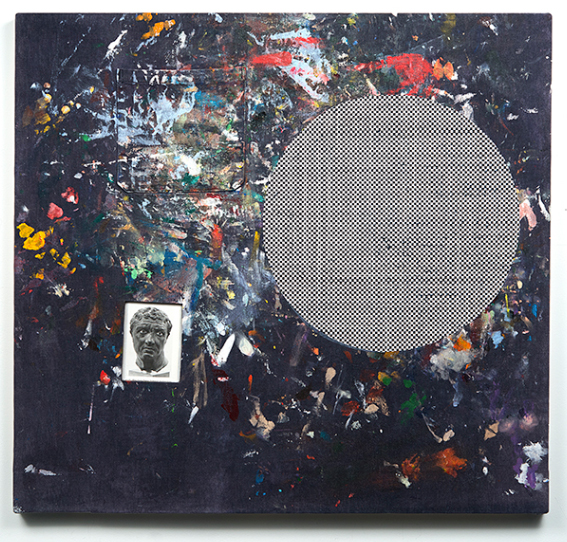 KW: I want to make a thing that does something particular and specific in relation to your act of looking at it. The way the parts of the painting are arranged might deny you full access to what one would assume is made to be seen, like when the painted face of the canvas is hidden. Maybe a painting is foregrounding something that is normally just a non-visual support, like the wooden stretcher or staples. It could be transposing its parts in a way that presents like a puzzle, or messing up your perception of a pattern with slight displacements, like a grain of sand in an oyster. Generally each painting is doing something different. For a number of years, I was doing this in a visual language that was geometrical, abstract and material, but excluded representation. Occasionally I borrowed human shapes from sculptures or paintings from art history, but they would be barely recognizable as figures the way I used them, just contours filled in with painted pattern. More recently, though, I’ve been introducing collaged images into that situation. Usually they are photos of heads or figures from ancient sculpture. The presence of these entities speaks to the act of looking in different ways. They can become a kind of proxy for the viewer, reacting to some abstract thing within the painting which they connect to with their gaze. So they model or re-enact our encounter with the painting itself. Or sometimes they are bursting into the middle of an abstract painting, as if they had opened the wrong door by mistake. It’s another angle on the idea of an encounter. The through-line in all of it is looking at an unknown thing or situation and pointing to the space of not knowing.