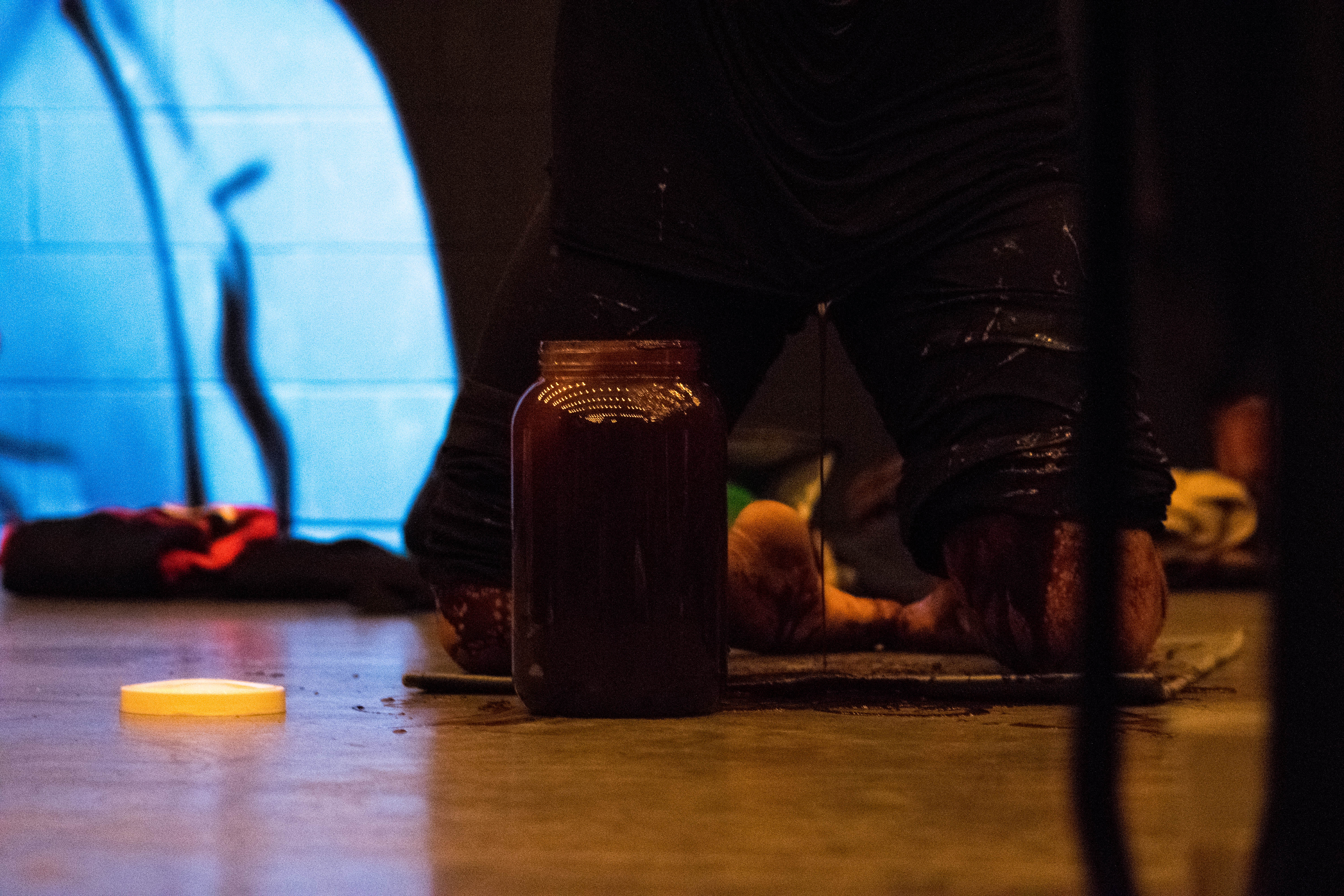 Cruz and his party are on the floor. Their forms are briefly still, but then move toward and under their audience. Beneath the voyeurs’ chairs are jars of pure, clean water. Like mana, the performers seem to crave the water and use it to sustain and regain their energy. As if “a cleansing,” they bathe themselves, purifying their bodies of their chocolate indulgence.