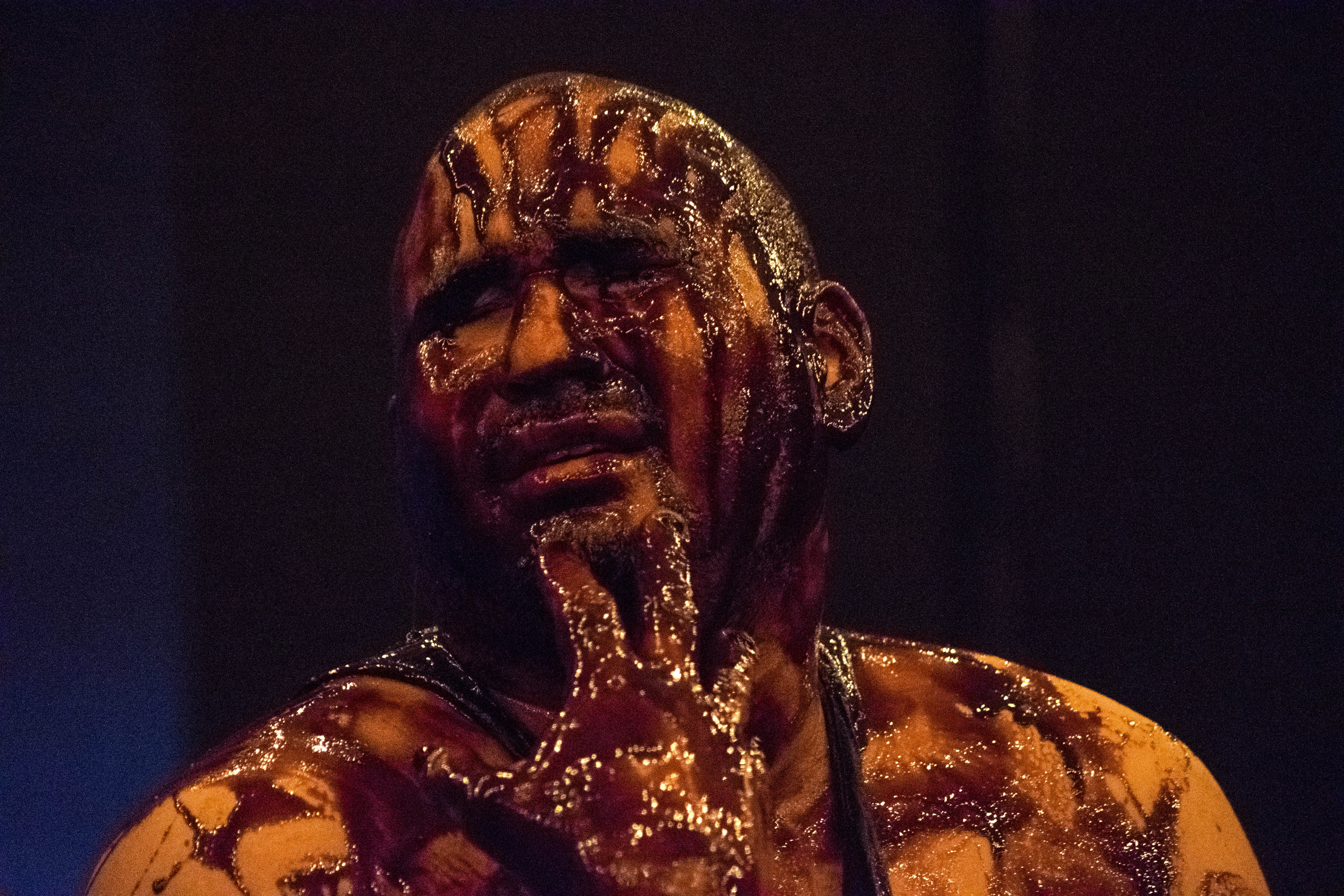 Cruz is the first the act, but the others quickly follow. Pulling from behind, he delivers a large bucket of chocolate syrup and is quick to engage with it. Hands in, grabbing substance, pulling out, spreading over his body. The others mimic David’s actions and together they create a churning sea of moving limbs and chocolate splatter.